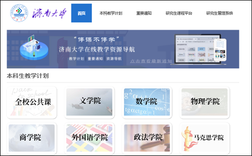 貫徹“停課不停教,停課不停學”的總要求,確保線上教學順利進行。根據(jù)學校疫情防控期間教學組織與管理工作方案,信息管理處協(xié)助教務處及研究生院,完成了“濟南大學線上教學資源導航”專題網(wǎng)站的建設,將本科教學計劃、研究生課程平臺,重要通知等相關教學資源等集成于一體,為線上教學提供一站式教學計劃及課程資源導航。