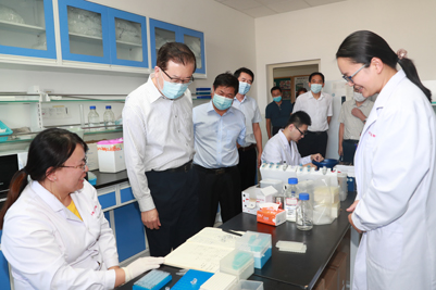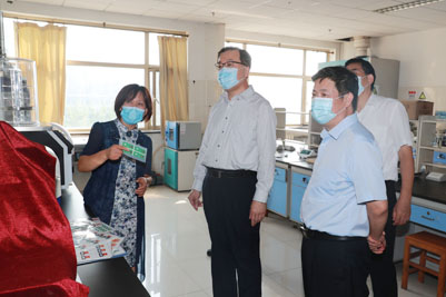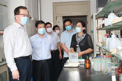 張江汀部長一行首先參觀了學(xué)校黨外知識分子聯(lián)誼會副會長于京華教授的實驗室,該實驗室是學(xué)校首批掛牌成立的5個無黨派人士工作室之一。于京華教授團(tuán)隊長期致力于紙基微流控、仿生傳感、食品安全等領(lǐng)域的研究,先后主持了國家自然科學(xué)基金面上項目5項、“863”計劃課題1項,榮獲山東省自然科學(xué)一等獎1項。隨后,張江汀部長參觀了化學(xué)化工學(xué)院顏梅教授、李村成教授、薄其兵教授和生物科學(xué)與工程學(xué)院秦曉春教授的實驗室。每到一處,張江汀部長都饒有興趣地與老師們交流,勉勵科研人員要瞄準(zhǔn)世界科技前沿,在核心關(guān)鍵技術(shù)上久久為功,力爭有所突破。