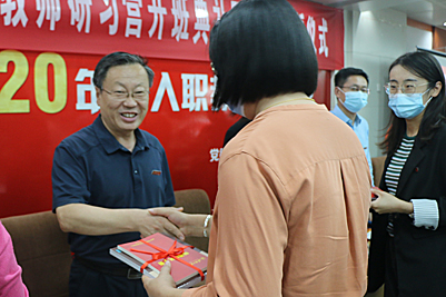 首先舉行新入職教師入職宣誓儀式。校長張士強(qiáng),副校長王志和各部門負(fù)責(zé)人為新入職教師代表佩戴?;詹①浰蜁?。在國旗前,由自動化與電氣工程學(xué)院王焱教授領(lǐng)誓,全體新入職教師高舉右手,面向國旗,莊嚴(yán)宣誓。隨后,新教師郭謙代表全體學(xué)員發(fā)言,表示將認(rèn)真參加研習(xí),努力成為合格的教師;王焱教授代表老教師對新入職教師表達(dá)了殷切期望和祝福。