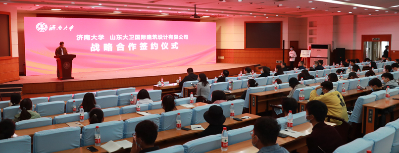 10月14日下午,濟(jì)南大學(xué)與山東大衛(wèi)國際建筑設(shè)計有限公司戰(zhàn)略合作簽約儀式在學(xué)校第一報告廳舉行。濟(jì)南大學(xué)黨委書記徐景顏、校長張士強(qiáng),山東大衛(wèi)國際建筑設(shè)計有限公司董事長申作偉,濟(jì)南大學(xué)黨委副書記王玉華、副校長李光紅,山東大衛(wèi)國際建筑設(shè)計有限公司總經(jīng)理張冰,副總經(jīng)理王健、徐術(shù)隴、申建,以及山東大衛(wèi)國際建筑設(shè)計有限公司總工辦、運(yùn)營部、人事部、宣傳部、 董事長辦公室等負(fù)責(zé)同志和濟(jì)南大學(xué)辦公室、人力資源處、教務(wù)處、合作發(fā)展處、土木建筑學(xué)院、美術(shù)與設(shè)計學(xué)院等相關(guān)部門和學(xué)院的負(fù)責(zé)同志、教師、學(xué)生代表出席簽約儀式。簽約儀式由王玉華副書記主持。