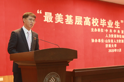 2019年底,中央宣傳部、人力資源社會(huì)保障部授予王輝、文竹、代東援、劉天嬌、齊曉景、李晶、楊媚、金彩虹、宗立冬、陶建剛等10位同志“最美基層高校畢業(yè)生”稱號(hào)。為積極引導(dǎo)高校畢業(yè)生樹立面向基層就業(yè)創(chuàng)業(yè)的擇業(yè)觀,大力弘揚(yáng)扎根基層、青春報(bào)國(guó)的寶貴精神,近期,中宣部和人社部組織開展“最美基層高校畢業(yè)生”先進(jìn)事跡宣講活動(dòng),組織2019年“最美基層高校畢業(yè)生”稱號(hào)獲得者向廣大青年學(xué)生講述基層工作經(jīng)歷和成長(zhǎng)感悟,引導(dǎo)高校畢業(yè)生積極投身基層一線,更好服務(wù)脫貧攻堅(jiān)和鄉(xiāng)村振興戰(zhàn)略實(shí)施,在為民服務(wù)中實(shí)現(xiàn)人生價(jià)值。山東是地方巡回宣講活動(dòng)的4個(gè)省份8所高校之一,濟(jì)南大學(xué)是地方巡回宣講活動(dòng)的最后一站。