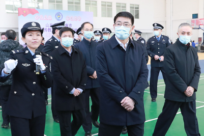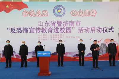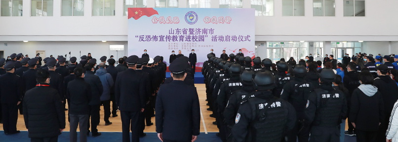 12月27日上午,山東省暨濟(jì)南市“反恐怖宣傳教育進(jìn)校園”活動(dòng)啟動(dòng)儀式在我校舉行。副省長(zhǎng)、省公安廳廳長(zhǎng)、省反恐怖工作領(lǐng)導(dǎo)小組副組長(zhǎng)范華平出席并宣布宣傳活動(dòng)啟動(dòng)。省委宣傳部副部長(zhǎng)魏長(zhǎng)民,學(xué)校黨委書記徐景顏,省公安廳副廳長(zhǎng)、省反恐辦主任修濰青,濟(jì)南市副市長(zhǎng)、市公安局局長(zhǎng)、市反恐怖工作領(lǐng)導(dǎo)小組副組長(zhǎng)吳德生,市中區(qū)區(qū)委書記韓永軍,學(xué)校副校長(zhǎng)楊景波、副校長(zhǎng)張勇出席活動(dòng)。省教育廳和濟(jì)南市有關(guān)反恐成員單位負(fù)責(zé)同志,市公安局相關(guān)警種和各分、縣局負(fù)責(zé)同志,學(xué)校師生代表、志愿者、應(yīng)急救援力量等共約300余人參加活動(dòng)。濟(jì)南市委常委、政法委書記、市反恐怖工作領(lǐng)導(dǎo)小組組長(zhǎng)秦傳濱主持啟動(dòng)儀式。
