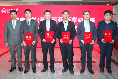 儀式上,張士強(qiáng)校長(zhǎng)為鄭慶水董事長(zhǎng)頒發(fā)濟(jì)南大學(xué)產(chǎn)業(yè)教授聘書(shū)。劉宗明副校長(zhǎng)和鄭慶水董事長(zhǎng)代表雙方簽訂合作協(xié)議。張士強(qiáng)校長(zhǎng)、王天瑞主任、成昌慧主任和鄭慶水董事長(zhǎng)共同為濟(jì)南大學(xué)(圣瑪麗亞)醫(yī)學(xué)研究院揭牌。人力資源處滕晉處長(zhǎng)為濟(jì)南圣瑪麗亞醫(yī)院五位專(zhuān)家頒發(fā)濟(jì)南大學(xué)顧問(wèn)教授聘書(shū)。鄭慶水董事長(zhǎng)為劉宏教授、陳貞翔教授、楊杰書(shū)記、何文興教授、孫明旭副教授頒發(fā)濟(jì)南大學(xué)(圣瑪麗亞)醫(yī)學(xué)研究院中心主任聘書(shū)。