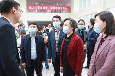 在招聘會現(xiàn)場,張碩秋副書記與單位招聘人員以及畢業(yè)生們進行了深入交流,了解用人單位對人才需求現(xiàn)狀、畢業(yè)生綜合素質(zhì)的看法,并向一直以來關(guān)心和支持濟南大學(xué)教育教學(xué)事業(yè)發(fā)展的各用人單位表示感謝,她希望通過此次招聘會搭建用人單位和畢業(yè)生雙向選擇平臺,為高校畢業(yè)生提供更多的就業(yè)選擇;鼓勵畢業(yè)生們把握求職機遇,樹立正確擇業(yè)觀,在各行各業(yè)為國家和社會貢獻青春才智。