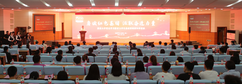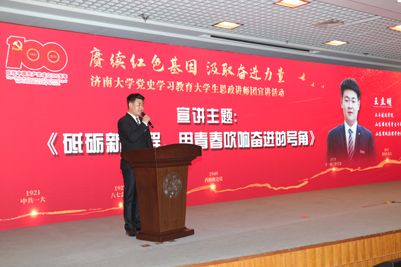 土木建筑學(xué)院王立明以《砥礪新征程,用青春吹響奮進(jìn)的號(hào)角》為題,從習(xí)近平總書記對(duì)青年成長進(jìn)步念茲在茲出發(fā),呼吁新時(shí)代大學(xué)生應(yīng)當(dāng)立足百年大黨新起點(diǎn),置身百年未有大變局,接力百年奮斗新征程,砥礪前行,用青春吹響奮進(jìn)的號(hào)角;材料科學(xué)與工程學(xué)院王巖以《跨越時(shí)空對(duì)話 筑夢(mèng)青春理想》為題,回顧學(xué)校建校70余年崢嶸發(fā)展歷程和輝煌辦學(xué)成就,以校史中的紅色基因傳承和校友們接續(xù)創(chuàng)新和奮進(jìn)為主線,追尋濟(jì)南大學(xué)發(fā)展的歷史足跡,探尋一代又一代“濟(jì)大人”鐫刻在時(shí)光里的紅色記憶;文化和旅游學(xué)院李鋆洋以《讓紅色精神放射出新的時(shí)代光芒》為題,講述自己的曾姥爺張冠增跨越戰(zhàn)爭(zhēng)年代與和平時(shí)期“一把手術(shù)刀,一顆醫(yī)者心”的革命故事,以紅色家風(fēng)涵養(yǎng)初心使命,號(hào)召用好黨百年歷史的“活教材”,堅(jiān)定“功成不必在我,功成必定有我”的信念和決心,讓革命薪火代代相傳。政法學(xué)院齊志良以《最美生涯在軍旅,志存高遠(yuǎn)勵(lì)青春》為題,回望自己兩年軍旅生涯最美的歲月和參加國慶70周年大閱兵的無尚榮光,以及退伍復(fù)學(xué)584天里活躍在新生軍訓(xùn)帶訓(xùn)、征兵宣傳動(dòng)員一線“退伍不褪色”的軍人底色,以其堅(jiān)定無悔的選擇,成就了自己的“大成長”,鼓勵(lì)更多的青年大學(xué)生懷揣從軍報(bào)國的理想信念,攜筆從戎,把愛國之心化為報(bào)國之行,在軍營這個(gè)大熔爐里淬煉成鋼。音樂學(xué)院穆元煒以《歌聲中的黨史百年》為題,通過《國際歌》《沂蒙山小調(diào)》《唱支山歌給黨聽》《在希望的田野上》《不忘初心》《驕傲的青年》等紅色歌曲,與泉城合唱團(tuán)共同演繹這些耳熟能詳?shù)慕?jīng)典旋律,再現(xiàn)歌曲創(chuàng)作背后一代代音樂工作者鐫刻歷史記憶、承載時(shí)代精神的氣概與情懷,以音樂回望黨史,用歌聲銘記初心。活動(dòng)最后,全體師生起立同唱《沒有共產(chǎn)黨就沒有新中國》。