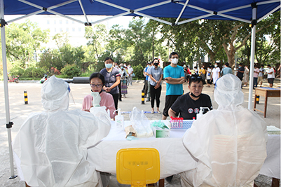 在采樣現(xiàn)場,醫(yī)護人員穿著密不透風的防護服、佩戴醫(yī)用防護口罩,盡管汗水浸濕了內(nèi)衣,但依然有條不紊地進行采樣工作。參檢人員按醫(yī)院工作人員和志愿者的指引,掃描報到二維碼,按流程有序進行檢測采樣。服務(wù)保障組穿梭于各個采樣點,全力做好采樣物資準備、及時進行樣本傳遞工作。