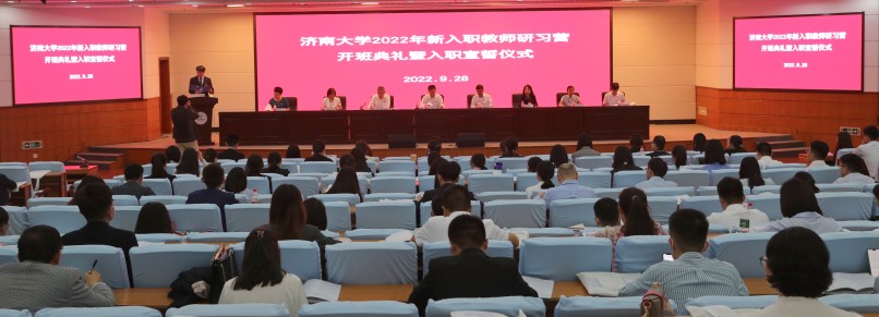 9月28日,濟南大學2022年新入職教師研習營開班典禮暨入職宣誓儀式在第一學術報告廳舉行。學校校長劉宗明,黨委常委、副校長張勇,黨委常委、副校長王霞,老教師代表、化學化工學院鄭庚修教授,黨委教師工作部 教師發展中心、人力資源處、教務處、科技處、社科處等部門負責人,2022年新入職教師研習營全體學員以及相關人員參加活動,儀式由張勇主持。