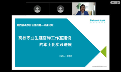北森生涯咨詢產品總監羅曉燕作《高校職業生涯咨詢工作室建設的本土化實踐進展》經驗分享,她基于生涯教育政策導向變化,圍繞生涯咨詢室本土化的實踐調研和本土化解決方案兩大板塊進行了詳細介紹,提出了包括基礎建設、師資培養、運營管理、資源統籌的咨詢室建設常規過程和各階段的典型特征,為進一步建設有特色的職業生涯咨詢工作室提供了科學的方法和思路。濟南大學學生生涯發展指導中心主任張晶作《基于在校經歷的大學生生涯規劃指導模式——以濟南大學為例》的經驗分享,他結合生動鮮活的實踐案例提出“在校經歷”的重要性,以學生工作實踐為依據提出在校經歷的類別劃分、發展維度和打造途徑,引出目標驅動(經典生涯規劃框架)、任務驅動(生涯發展五階段)、方向驅動(生涯模式四分類)三大生涯發展建構模式,并分享基于“在校經歷”的生涯指導方法和工作領域,為學生生涯發展指導提供了新的視角。山東省實驗中學東校升學指導中心主任高良元作《以生涯教育為抓手助推學生多元發展》的報告,他從高中生涯教育課程建設、生涯指導課程活動體系、相關的探討與需求等三個方面介紹了多元化促進高中學生生涯發展的工作思路、具體做法和實踐經驗,是新高考改革之后實現高高(高中-高校)銜接的有效途徑。青島大學學生生涯發展指導中心主任李瑩分享《“以學生為中心”—高校生涯教育心得》,李老師圍繞“以學生為中心”的核心目標,從對學生可操作、有實效的內容建設到讓學生喜歡聽、愿意用的呈現形式,介紹了學校的實踐經驗和特色做法,提出了學校的1234+生涯規劃與就業指導工作體系,為高校生涯課程建設提供了新思路。山東中醫藥大學招生就業處副處長、大學生就業指導中心主任劉同國作《高質量培訓,精準化指導,推進宏志助航計劃順利實施》的報告,他圍繞宏志助航計劃和工作實際,詳細介紹了“四到位”組織高質量培訓,“四抓實”開展精準化指導的培訓模式,并課程內容體系、培訓組織、資源整合等方面提供了科學性建議。
