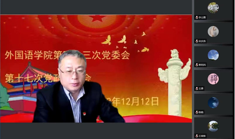 12月12日上午,學校黨委常委、副校長黃加棟出席指導外國語學院黨委會和黨政聯席會,會議以線上的方式進行,外國語學院全體班子成員參加會議,組織員、各黨支部書記列席會議。會議由學院黨委書記于文主持。