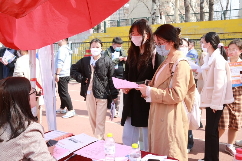 在學校體育場,參與線下招聘的372家用人單位沿跑道一字擺開,現場求職畢業生人來人往。在國企西電濟南變壓器股份有限公司招聘展位前,我校2023屆畢業生張佃華不僅投上了自己的簡歷,還替遠在外地上學的女友咨詢工作前景。“我是學機械工程專業的,這家企業招聘崗位對口,發展空間也不錯,而且濟南是個包容性強的城市,想和女友在濟南一起安家。”正在企業實習的張佃華聽說有就業雙選會后,立刻請假趕回學校求職。目前他已經手握一家企業的offer ,這次雙選會想找到更合適自己的企業。