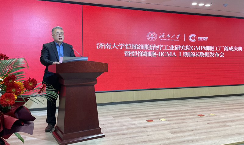 落成儀式上,黃加棟對研究院細胞制備廠房落成表示祝賀,對關心支持濟南大學發展的濟南市市中區人民政府、山東愷悌各位領導表示感謝,介紹了學校高水平大學建設以及生物醫藥相關學科發展情況,希望校企雙方在前期合作基礎上,以GMP細胞工廠落成為契機,聚焦生物醫藥國家發展戰略和行業發展趨勢,進一步整合力量,對接需求,實現產學研深度融合。