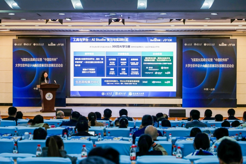 隨后,青島理工大學副校長王在泉、山東大學團委書記姜炳剛分別致辭介紹學校的基本情況,并表達對本次活動的高度關注以及對本次活動順利開展的美好愿景。百度AI技術生態總經理馬艷軍博士和山東大學數學與統計學院副院長兼山東大學數據科學研究院副院長郭亮教授、百度飛槳教育生態運營負責人錢芳分別以《“深度學習平臺+大模型”產業智能化基座》《校企融合,共探AI+X微專業人才培養新模式》《飛槳人工智能人才培養及2023年規劃》為題作專題報告。
