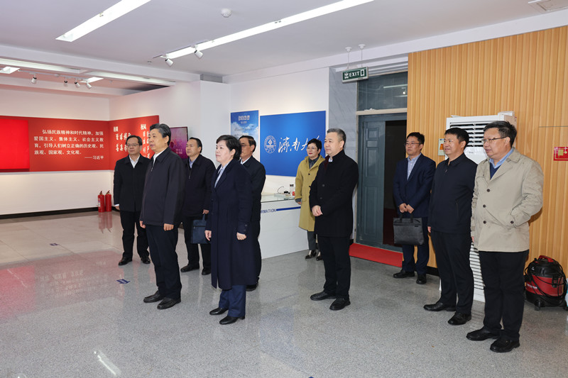 王藝華一行首先到學校新時代文明實踐中心進行實地調研,參觀了濟南大學辦學成就展和地方立法研究服務基地成果特展,詳細了解和詢問了濟南大學近年來的辦學特色、辦學成就和地方立法研究服務基地的建設情況。