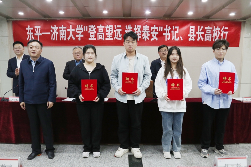 隨后,山東碩為思大數據科技有限公司趙遠總經理發言并為信息科學與工程學院宗西舉教授頒發山東碩為思大數據科技有限公司“人力資源副總經理”聘書,韓寧部長為濟南大學東平籍優秀學生代表頒發“校園引才大使”聘書,黃加棟副校長、徐立勇縣長為東平縣引才工作站(濟南大學站)揭牌。