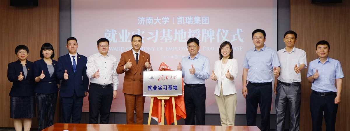 儀式上,學校合作發展處處長、教育發展基金會秘書長盧旺與凱瑞商業集團人力資源中心總監胡嘉簽署教育發展基金捐贈協議。楊景波與趙孝國共同為濟南大學就業實習基地揭牌。