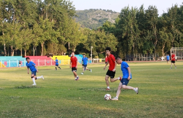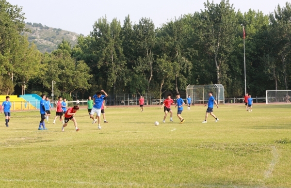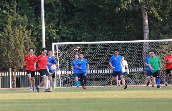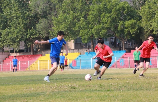 下午4時16分,師生齊聚北苑操場,在裁判的一聲哨響之后,這場令人期待已久的足球賽拉開序幕。劉宗明校長為本次足球賽開球,雙方隊員迅速進入狀態,球員們雄姿英發,紛紛開啟運動模式。上半場比賽,雙方隊員互不相讓,積極傳球,默契配合,充分發揮自己的特長,足球在他們的腳下靈活飛舞。下半場比賽,他們依舊以飽滿的激情,昂揚的斗志,團結向上的精神投入比賽,老師們排兵布陣,轉守為攻,接連進球,贏得一片歡呼喝彩;學生們積極拼搶,穩扎穩打,相互配合做好防守,多次防守成功振奮人心。最終老師們以4:1的比分贏得了本場比賽。隨后,老師和學生進行了點球友誼比賽。