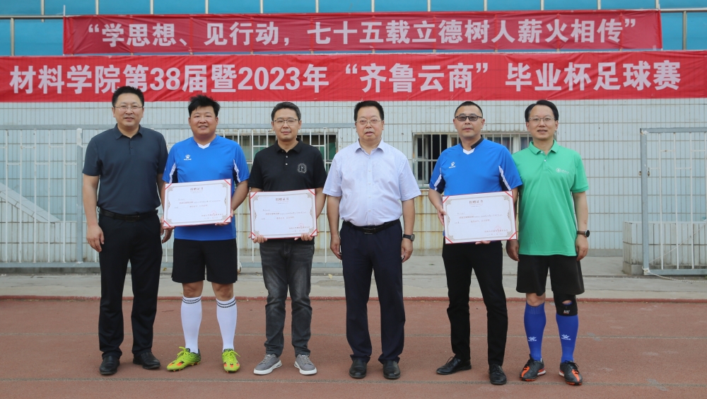 仲夏暑盛,萬物并秀,驕陽般的六月迎來了一年一度的畢業季。為促進師生間交流,追憶青蔥歲月,6月13日,材料科學與工程學院在北苑操場舉辦了第38屆暨2023年“齊魯云商”畢業杯足球賽。校長劉宗明,黨委常委、宣傳部部長賈海寧,優秀校友、2007屆畢業生、齊魯云商總經理魏本磊,合作發展處、學院相關負責同志,部分在材料科學與工程學院學習和工作過的老師出席并觀看比賽。