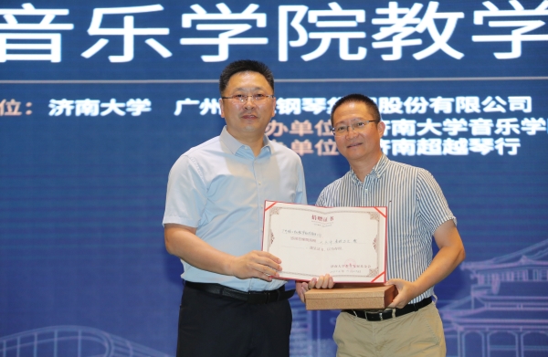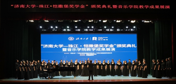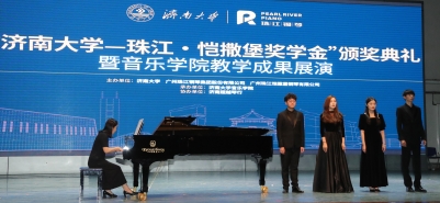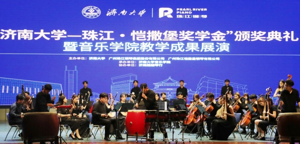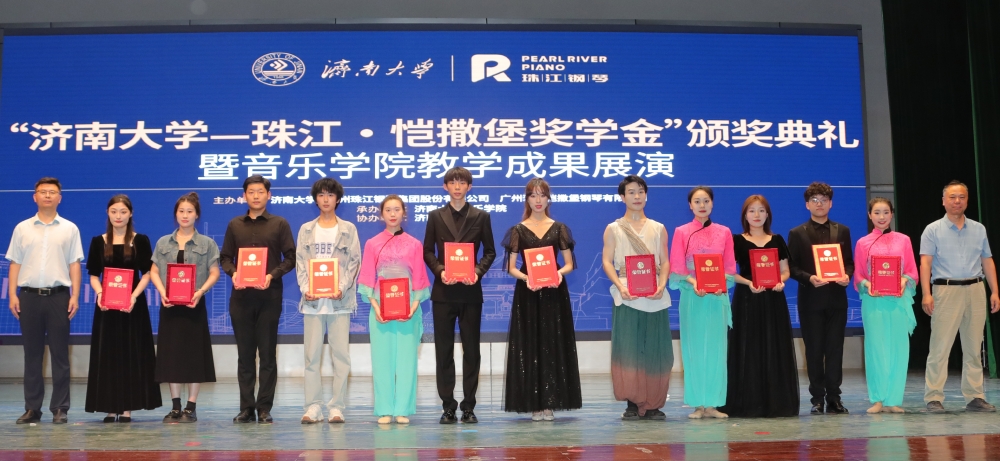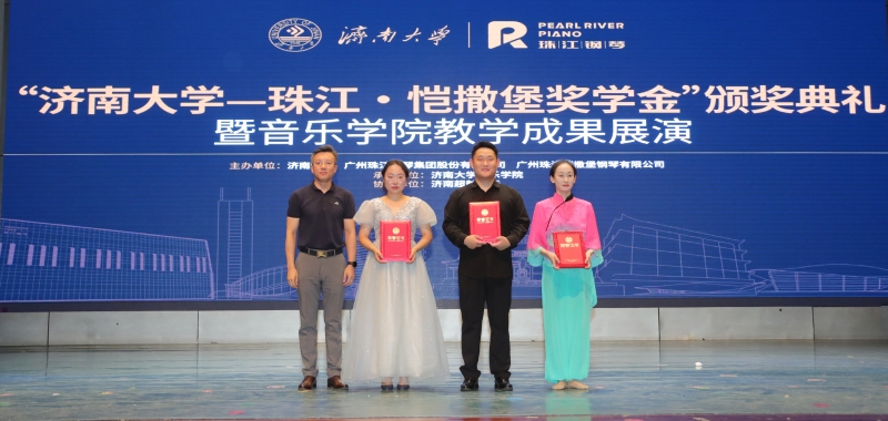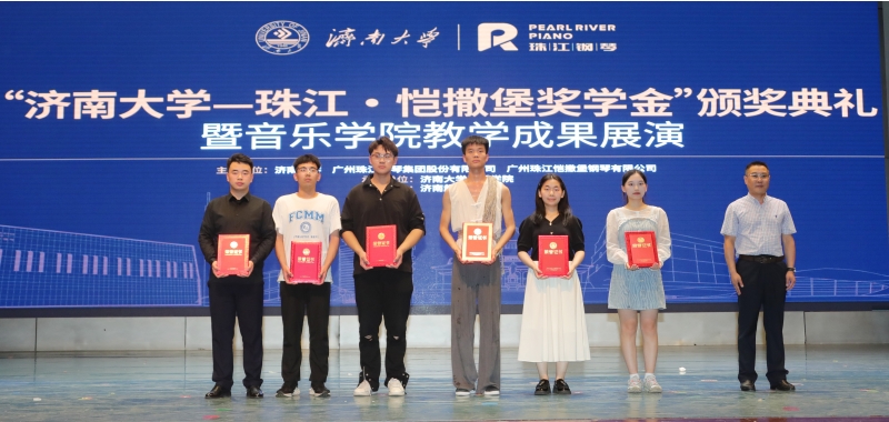 儀式上,濟南大學合作發展處處長、教育發展基金會辦公室主任盧旺為廣州珠江鋼琴集團股份有限公司頒授捐贈證書和紀念品。音樂學院黨委書記劉振宣讀獲得“濟南大學—珠江?愷撒堡獎學金”學生名單,到場的嘉賓和領導為獲獎學生頒獎。