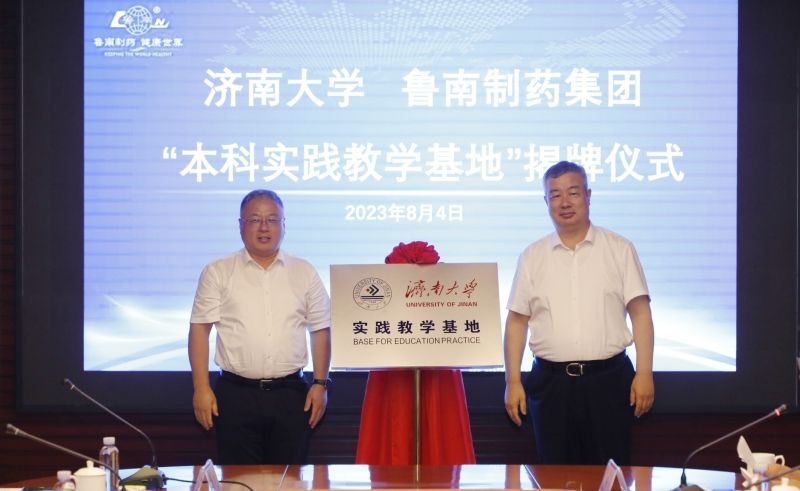 黃加棟和李寶杰代表雙方共同為“濟南大學—魯南制藥集團本科實踐教學基地”揭牌。