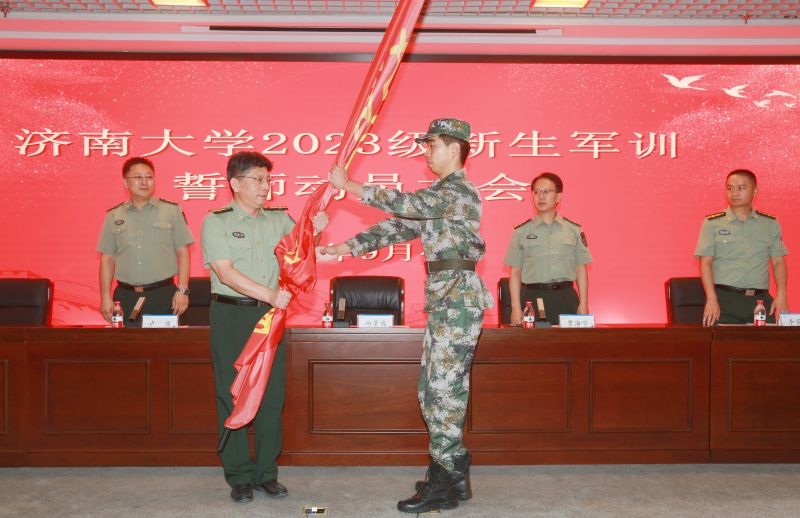 楊景波向軍訓師授旗并代表學校黨委向參加此次軍訓工作的各部門領導、各學院副書記、軍訓教導大隊的軍訓教官、軍事理論課教師、跟訓輔導員以及其他服務保障部門表示衷心的感謝和親切的問候。楊景波強調,軍訓是大學生國防教育的核心組成部分,承擔了國家法律賦予的重要使命。通過軍訓,引導學生傳承歷史文化,提高政治覺悟,強化國防意識,激發愛國情感;集體訓練培養集體主義觀念,強化紀律觀念,增強勇氣和堅毅意志;教授基本國防軍事知識,傳承先輩的奮斗精神,激發新時代的奮發圖強精神,塑造有為的新青年。