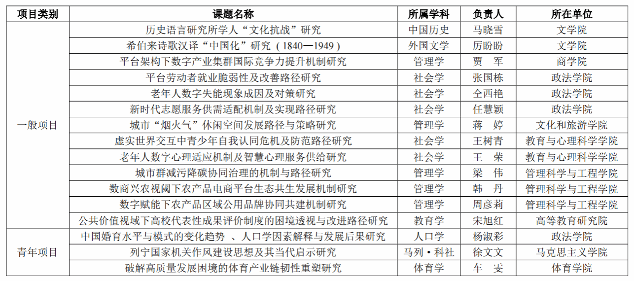 2023年度,我校國(guó)家社會(huì)科學(xué)基金立項(xiàng)課題分屬于8個(gè)文科學(xué)院、科研平臺(tái),其中政法學(xué)院4項(xiàng),管理科學(xué)與工程學(xué)院3項(xiàng),文學(xué)院、教育與心理科學(xué)學(xué)院各2項(xiàng),商學(xué)院、馬克思主義學(xué)院、體育學(xué)院、文化和旅游學(xué)院、高等教育研究院各1項(xiàng)。立項(xiàng)課題分布于7個(gè)學(xué)科,其中管理學(xué)、社會(huì)學(xué)各5項(xiàng),教育學(xué)、馬列·科社、人口學(xué)、體育學(xué)、外國(guó)文學(xué)、中國(guó)歷史各1項(xiàng)。我校社會(huì)學(xué)學(xué)科立項(xiàng)數(shù)量排名全國(guó)高校并列第1位,管理學(xué)學(xué)科立項(xiàng)數(shù)量排名全國(guó)高校并列第7位。