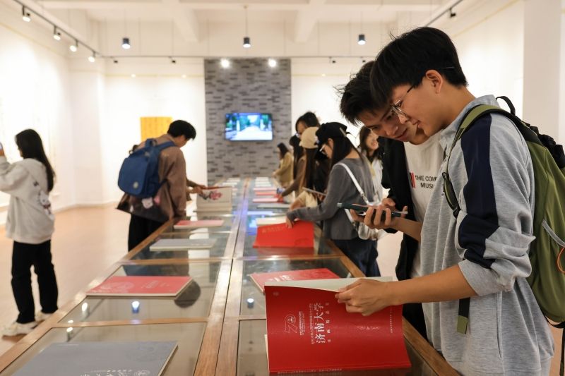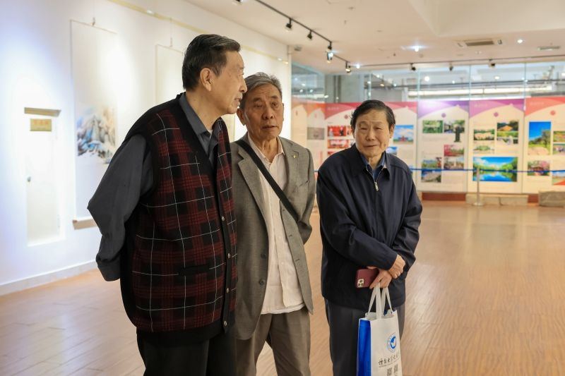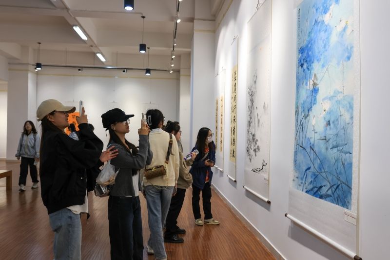 開幕式結(jié)束后,學(xué)校領(lǐng)導(dǎo)、師生代表共同進(jìn)入展館參觀。本次書畫展展出的作品風(fēng)格多樣,意境悠遠(yuǎn),大家在每幅展品前駐足留步,細(xì)心觀賞,感受師生們對(duì)祖國(guó)和學(xué)校的深情祝福。