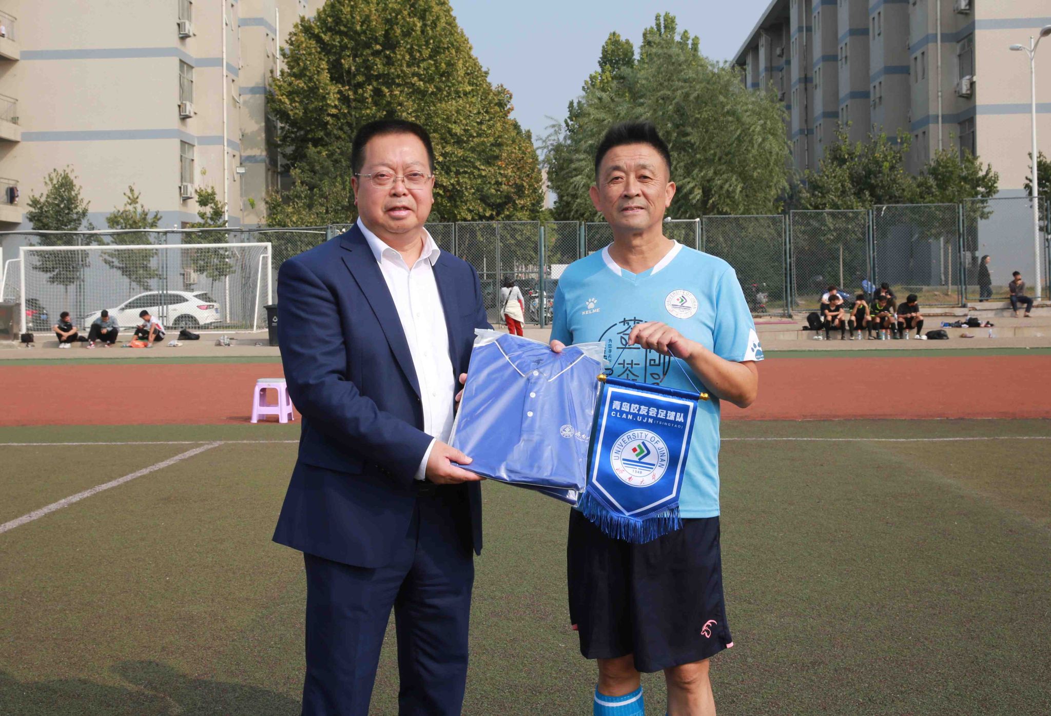 劉宗明校長(zhǎng)為足球友誼賽開(kāi)球。校友足球隊(duì)向?qū)W校贈(zèng)送了足球隊(duì)隊(duì)旗等紀(jì)念品。