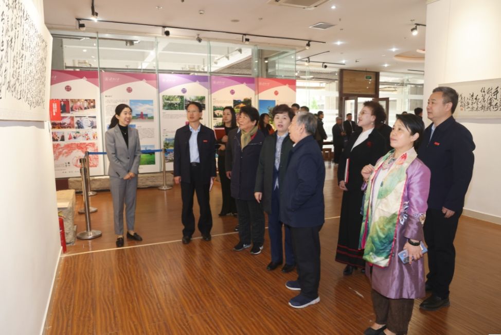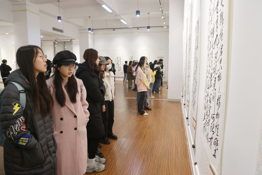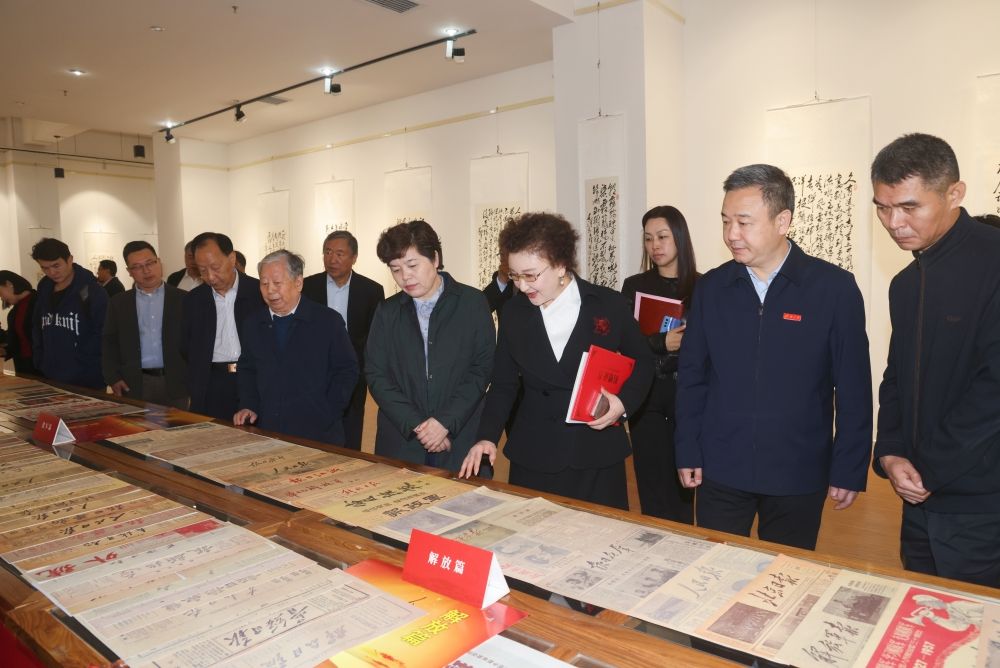 儀式結(jié)束后,與會嘉賓和師生代表前往學(xué)校舜道藝術(shù)館參觀賀惠邦先生手書毛澤東詩詞楹聯(lián)題詞作品展。大家在一幅幅書法作品前駐足觀賞或拍照留念,感悟毛體書法的恢弘氣勢和毛澤東詩詞楹聯(lián)題詞深厚的思想內(nèi)涵和特有的文學(xué)魅力。館內(nèi)陳列的《沒有共產(chǎn)黨就沒有新中國》百年館藏報紙,展示了中國共產(chǎn)黨波瀾壯闊百年歷史的紅色印記,一張張珍貴史料吸引了大家的目光、引發(fā)了大家的熱議。