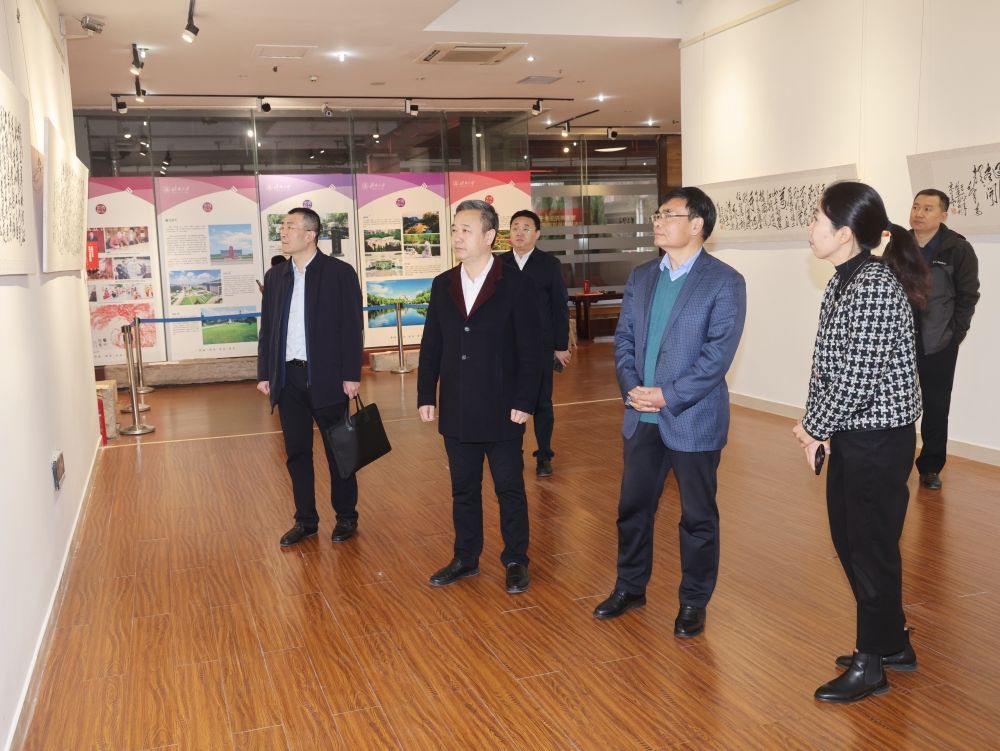 座談會(huì)前,胡興禹一行在查玉喜陪同下參觀了學(xué)校辦學(xué)成就展、舜道藝術(shù)館毛澤東詩(shī)詞楹聯(lián)題詞作品展。