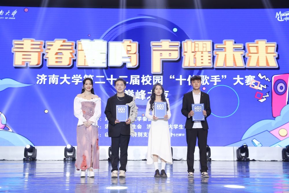 本屆“十佳歌手”大賽經(jīng)歷了初賽、復(fù)賽的層層選拔,最終15位選手站上總決賽的舞臺,爭奪“十佳歌手”稱號及冠亞季軍。本次決賽一輪定勝負(fù),經(jīng)過激烈比拼,信息科學(xué)與工程學(xué)院程至夏奪得冠軍,文學(xué)院邱月泉獲得亞軍,音樂學(xué)院袁夢琦和自動化與電氣工程學(xué)院何佩璇并列季軍。同時,冠亞季軍獲得選手與音樂學(xué)院辛肇涵、文學(xué)院張騫、水利與環(huán)境學(xué)院王宇軒、政法學(xué)院張子昂、SQA項目劉偉碩、外國語學(xué)院劉君蔚共同獲得濟(jì)南大學(xué)第二十二屆校園“十佳歌手”稱號。比賽期間,學(xué)校官方公眾號開啟了“最佳人氣獎”線上投票通道,SQA項目劉偉碩、體育學(xué)院李博陽、生物科學(xué)與技術(shù)學(xué)院黃夢薇獲得“人氣歌手”稱號。
