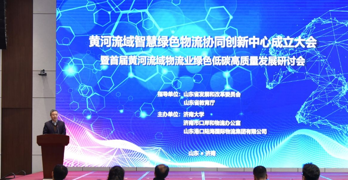 12月18日,黃河流域智慧綠色物流協同創新中心成立大會暨首屆黃河流域物流業綠色低碳高質量發展研討會在濟南召開。中國物流學會副會長兼秘書長、中國物流與采購聯合會副秘書長、教育部物流教指委秘書長郭肇明,山東省發展和改革委員會黃河戰略推進處副處長王洪興,濟南大學黨委副書記查玉喜出席會議并致辭。