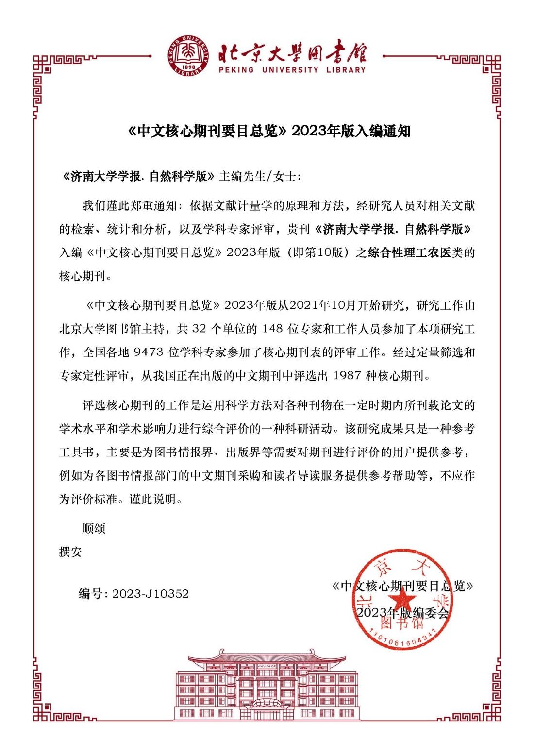 經(jīng)過定量篩選和專家定性評審,《中文核心期刊要目總覽》2023年版(即第10版)共從我國正在出版的中文期刊中評選出1987種核心期刊。這是該刊繼2008年版(即第5版)首次入選后,連續(xù)6次入選中文核心期刊要目。