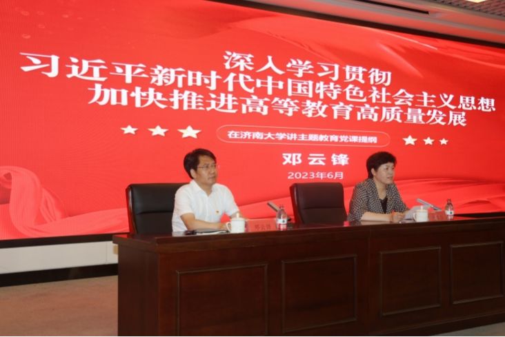 4月14日,濟(jì)南大學(xué)召開學(xué)習(xí)貫徹習(xí)近平新時(shí)代中國特色社會(huì)主義思想主題教育工作會(huì)議。學(xué)校黨委書記、主題教育領(lǐng)導(dǎo)小組組長劉春華作動(dòng)員講話,省委主題教育第二十二巡回指導(dǎo)組組長、濟(jì)寧市政協(xié)主席霍媛媛出席并作指導(dǎo)講話。6月28日上午,副省長鄧云鋒到濟(jì)南大學(xué)講授主題教育專題黨課。學(xué)校黨委按照中央、省委統(tǒng)一部署,牢牢把握“學(xué)思想、強(qiáng)黨性、重實(shí)踐、建新功”總要求,堅(jiān)持理論學(xué)習(xí)、調(diào)查研究、推動(dòng)發(fā)展、檢視整改有機(jī)融合、一體推進(jìn),教育引導(dǎo)黨員、干部把習(xí)近平新時(shí)代中國特色社會(huì)主義思想轉(zhuǎn)化為堅(jiān)定理想、錘煉黨性和指導(dǎo)實(shí)踐、推動(dòng)工作的強(qiáng)大力量,推動(dòng)學(xué)校高質(zhì)量發(fā)展取得扎實(shí)成效。