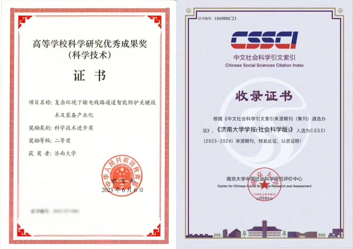 7月,濟(jì)南大學(xué)作為第一完成單位、信息科學(xué)與工程學(xué)院李金屏教授作為第一完成人的成果“復(fù)雜環(huán)境下輸電線路通道智能防護(hù)關(guān)鍵技術(shù)及裝備產(chǎn)業(yè)化”獲得教育部科學(xué)技術(shù)進(jìn)步獎(jiǎng)二等獎(jiǎng)。2023年,學(xué)校獲批國家級(jí)自然科學(xué)項(xiàng)目59項(xiàng),20項(xiàng)科技成果獲省部級(jí)獎(jiǎng)勵(lì),授權(quán)國家發(fā)明專利481項(xiàng),發(fā)表高水平科研論文1351篇。獲批國家社科基金年度項(xiàng)目與青年項(xiàng)目16項(xiàng),立項(xiàng)總數(shù)排名全國高校并列第92位、山東省屬高校并列第4位。獲得山東省社科優(yōu)秀成果獎(jiǎng)15項(xiàng),獲獎(jiǎng)數(shù)量排名省屬高校第4位?!稘?jì)南大學(xué)學(xué)報(bào)(社會(huì)科學(xué)版)》再次入選CSSCI來源期刊(2023-2024),1篇論文獲評(píng)中宣部組織的主題出版宣傳好文章,1個(gè)欄目入選中宣部評(píng)定的全國學(xué)術(shù)期刊重點(diǎn)專欄建設(shè)名單。