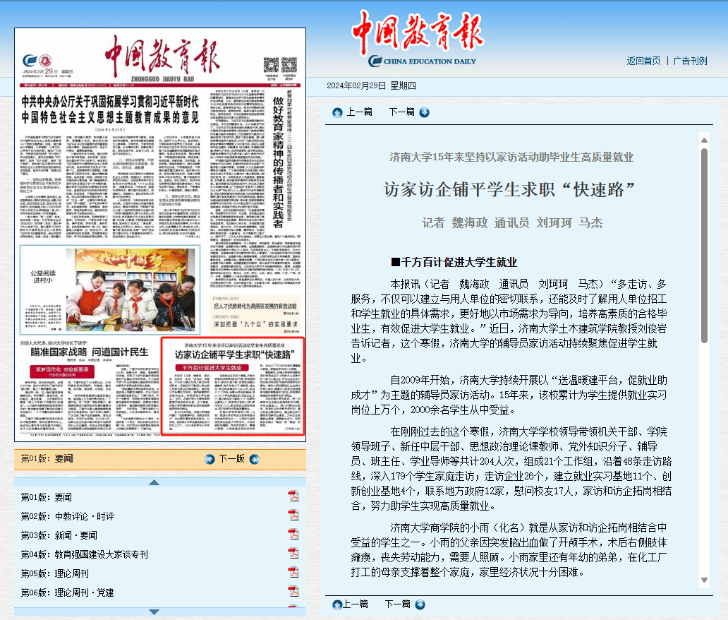 2月29日,《中國教育報》頭版刊發(fā)通訊文章《濟南大學15年來堅持以家訪活動助畢業(yè)生高質(zhì)量就業(yè) 訪家訪企鋪平學生求職“快速路”》,詳細報道了我校以家訪活動助力畢業(yè)生高質(zhì)量就業(yè)工作開展情況。