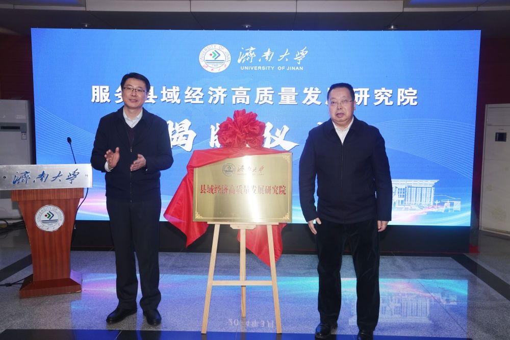 儀式上,史志遠(yuǎn)和劉宗明為“濟(jì)南大學(xué)服務(wù)縣域經(jīng)濟(jì)高質(zhì)量發(fā)展研究院”揭牌。