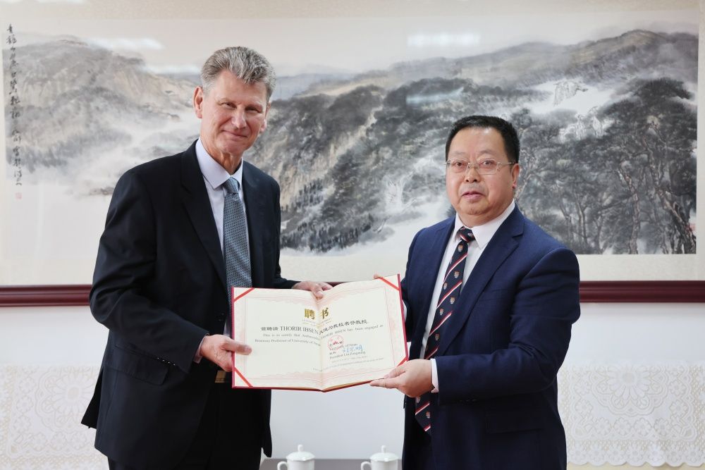 劉宗明對大使一行表示歡迎,并簡要介紹了濟南大學(xué)及冰島研究中心概況,感謝冰島駐華使館一直以來對濟南大學(xué)及冰島研究中心的支持和幫助,并為易卜雷大使頒發(fā)濟南大學(xué)榮譽教授聘書。他希望大使先生及冰島駐華使館繼續(xù)支持濟南大學(xué),推動雙方在人才培養(yǎng)、科學(xué)研究及中冰合作方面取得務(wù)實成果。