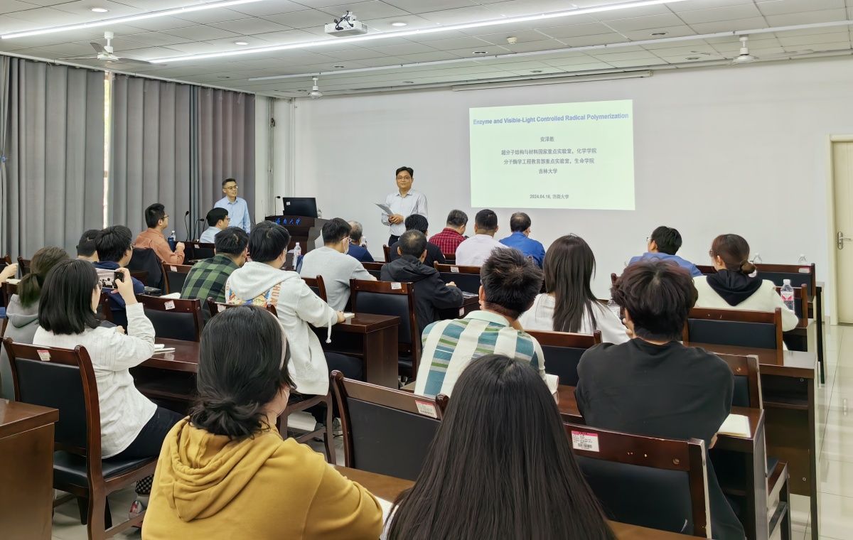 安澤勝教授以《酶和可見(jiàn)光控制自由基聚合》為題作學(xué)術(shù)報(bào)告,主要介紹了天然酶和可見(jiàn)光介導(dǎo)自由基聚合方面的研究進(jìn)展,重點(diǎn)講述了酶催化RAFT聚合研究方向,提出了光酶催化精確合成聚合物的新概念,實(shí)現(xiàn)了可見(jiàn)光調(diào)控與酶催化兩種環(huán)境友好體系的有機(jī)結(jié)合,為進(jìn)一步推動(dòng)酶催化的多樣性并將其用于可控自由基聚合開(kāi)辟了新途徑;建立了聚合誘導(dǎo)自組裝調(diào)控聚合物膠體微粒形貌的方法,揭示了膠體微粒的形貌轉(zhuǎn)化機(jī)理,實(shí)現(xiàn)了在高固體含量下對(duì)聚合物分子量、構(gòu)型與組裝體形貌的有效控制。