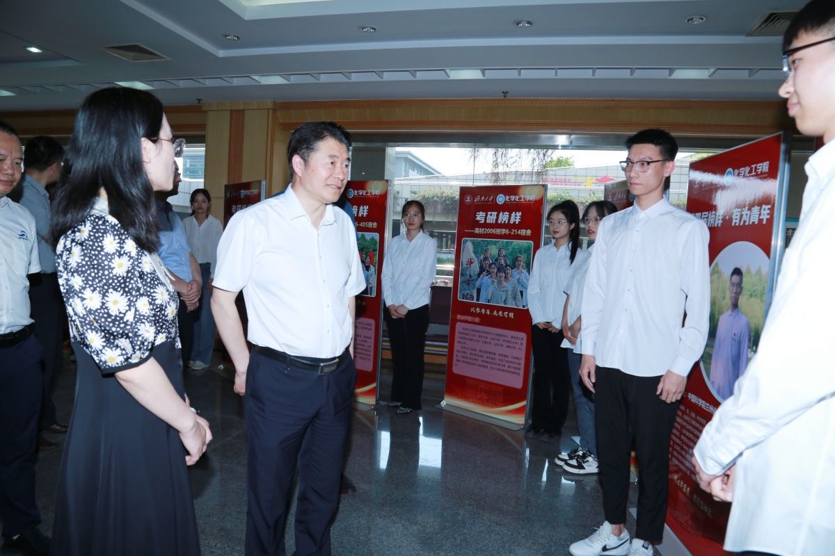 表彰大會(huì)前,領(lǐng)導(dǎo)嘉賓參觀了化學(xué)化工學(xué)院第四屆“榜樣·有為青年”優(yōu)秀學(xué)生事跡展,并與榜樣團(tuán)成員代表進(jìn)行了親切交流。
