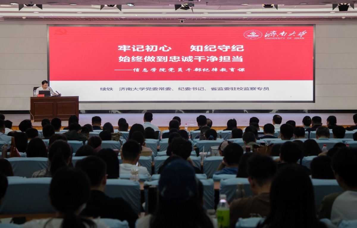 為扎實開展黨紀學習教育,進一步強化紀律意識、加強自我約束、提高免疫能力,增強政治定力、紀律定力、道德定力、抵腐定力,始終做到忠誠干凈擔當,根據(jù)中央、省委和學校黨委“關于在全黨開展黨紀學習教育”的相關通知要求和工作方案部署,同時,為認真落實2024屆畢業(yè)生廉潔教育等系列活動要求,5月28日,學校黨委常委、紀委書記、省監(jiān)委駐濟南大學監(jiān)察專員續(xù)鐵以《牢記初心,知紀守紀——始終做到忠誠干凈擔當》為題,在第一學術報告廳為信息科學與工程學院全體黨員及畢業(yè)生代表共計三百余人講授專題黨課。學院黨委書記夏衛(wèi)東主持黨課活動。