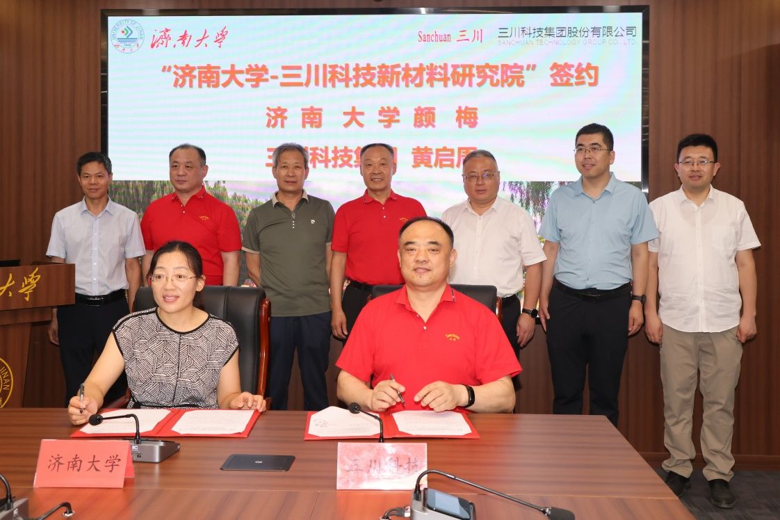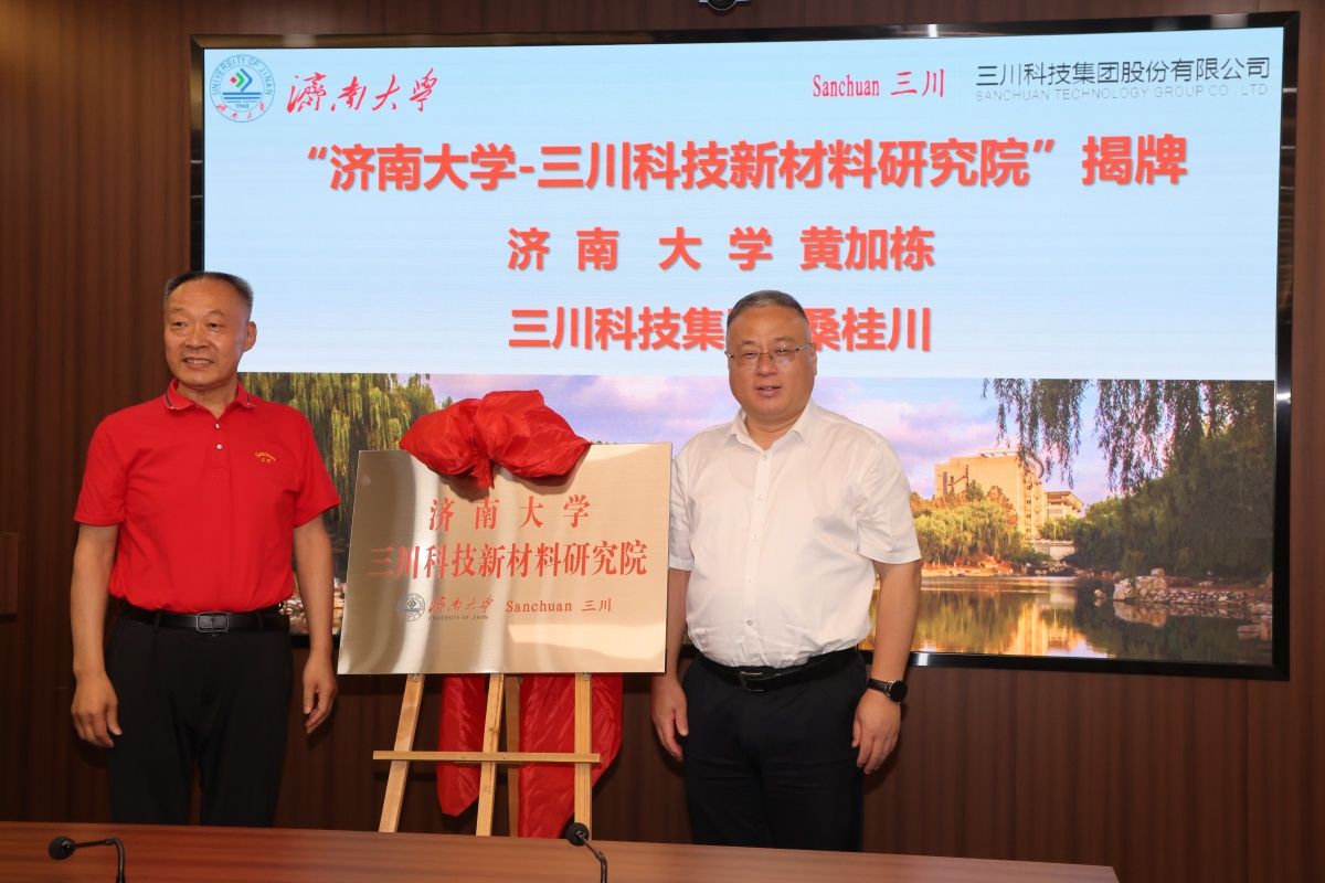 6月12日,濟(jì)南大學(xué)與三川科技集團(tuán)股份有限公司共建“濟(jì)南大學(xué)——三川科技新材料研究院”(以下簡(jiǎn)稱研究院)簽約暨揭牌儀式在濟(jì)南大學(xué)舉行。三川科技集團(tuán)股份有限公司董事長(zhǎng)桑桂川、副總經(jīng)理黃啟周及相關(guān)人員參加活動(dòng),學(xué)校黨委常委、副校長(zhǎng)黃加棟出席會(huì)議,學(xué)??萍继?、科技成果轉(zhuǎn)化辦公室、材料科學(xué)與工程學(xué)院等負(fù)責(zé)同志和專家教授參加簽約暨揭牌儀式。儀式由科技處處長(zhǎng)顏梅主持。