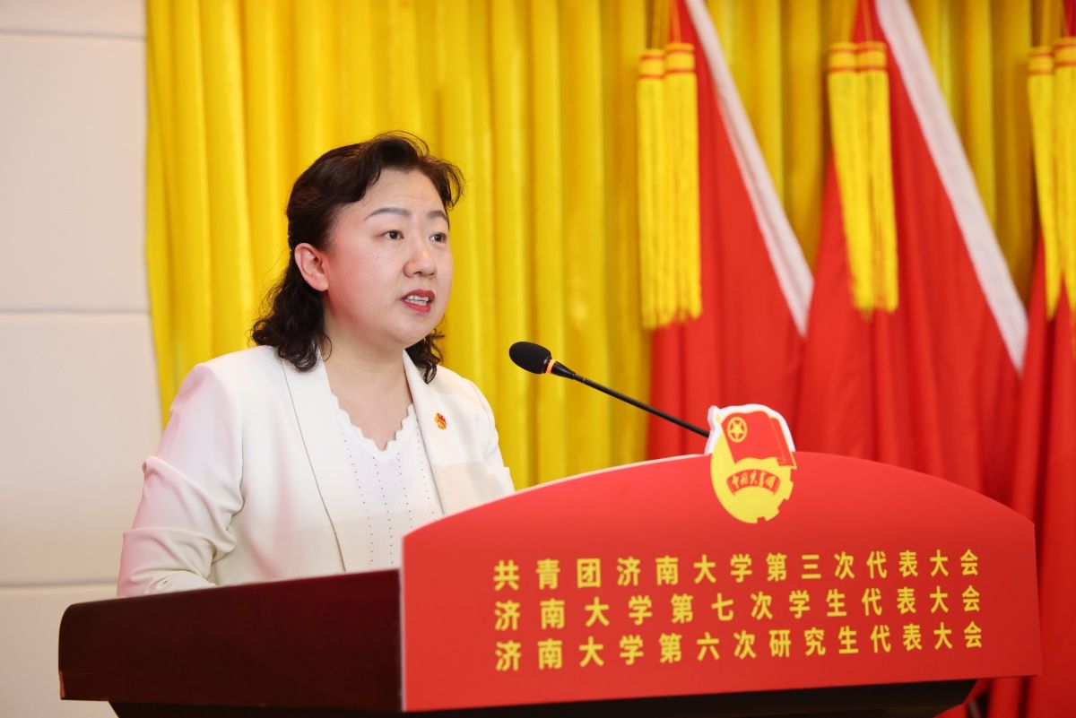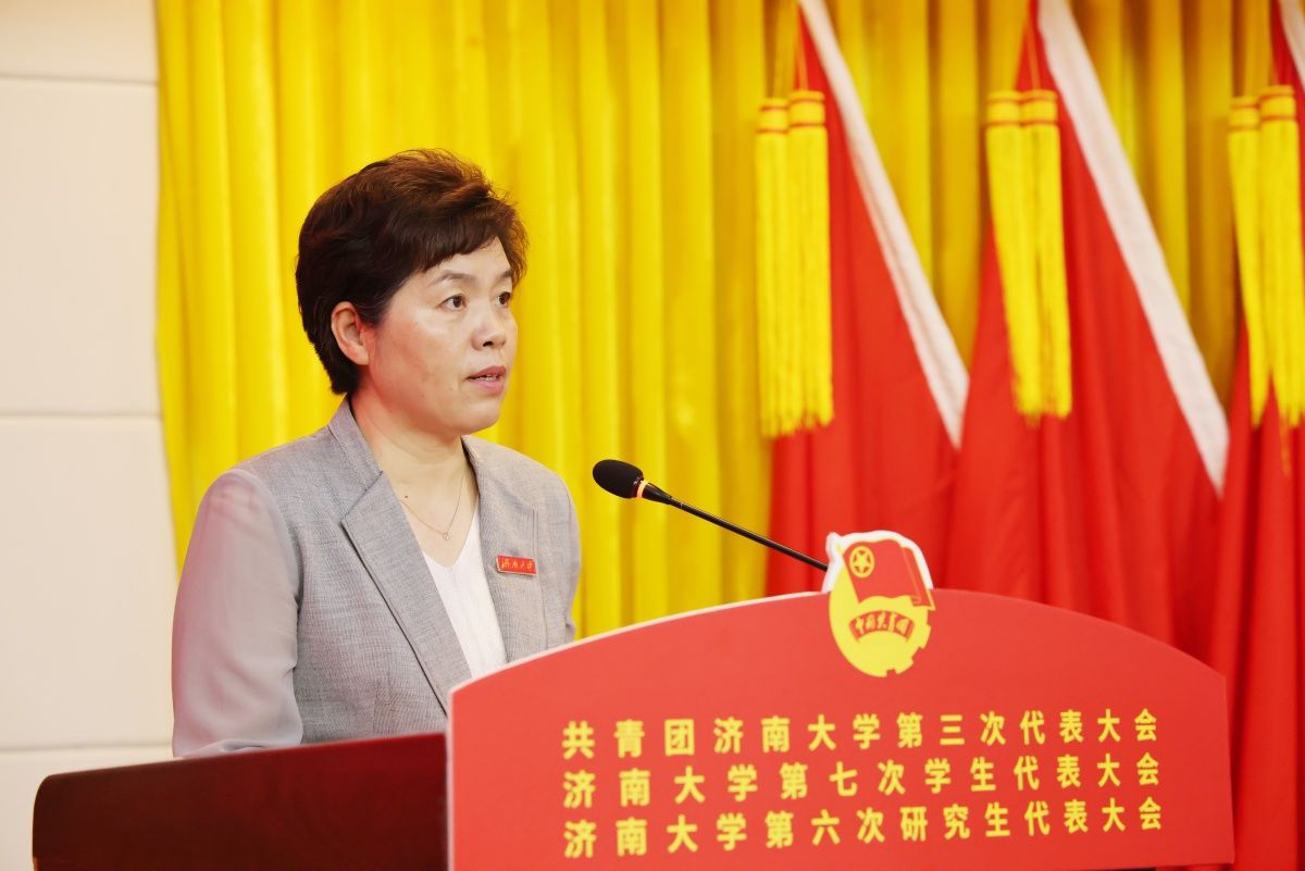劉春華代表學(xué)校黨委向大會的召開表示祝賀,向長期以來關(guān)心和支持學(xué)校共青團工作的共青團山東省委、共青團濟南市委、共青團市中區(qū)委,兄弟院校及社會各界表示感謝。她在講話中對第二次團代會以來的學(xué)校共青團工作給予充分肯定,并對學(xué)校共青團和廣大青年提出三點要求和希望,一是共青團要提高政治站位,強化思想政治引領(lǐng),全力服務(wù)青年成長,堅持全面從嚴(yán)治團,鍛造走在前列的先進(jìn)組織;二是廣大團干部要堅持守正創(chuàng)新,全面提升能力水平,錘煉扎實工作作風(fēng),圍繞中心服務(wù)大局,淬煉奮發(fā)有為的團干部隊伍。三是廣大團員青年要勇?lián)鷷r代使命,樹牢理想信念,練就過硬本領(lǐng),永葆青春本色,爭做能堪重任的青年先鋒。