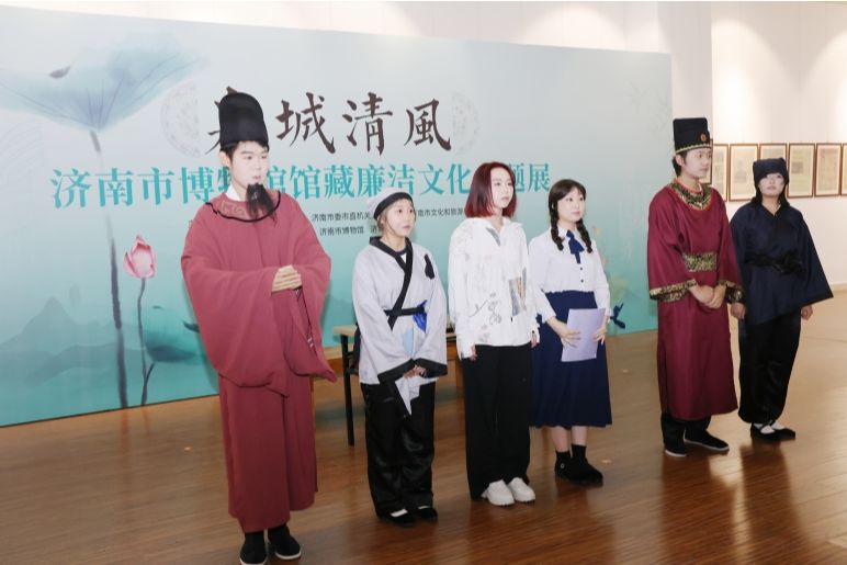 儀式結(jié)束后,在濟南市博物館講解員的講解下,與會人員參觀展覽并觀看文學(xué)院青筍劇團出演的廉潔主題短劇《天下蒼生》。此外,現(xiàn)場還展出了“清廉”元素系列文創(chuàng)產(chǎn)品,受到一致好評。