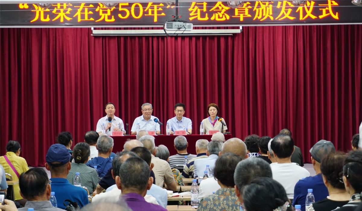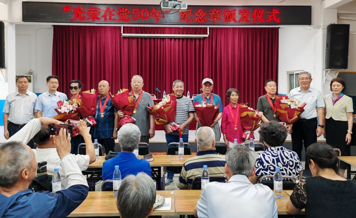 6月27日上午,在中國共產(chǎn)黨成立103周年之際,學校“光榮在黨50年”紀念章頒發(fā)儀式在離退休工作處多功能廳舉行。學校黨委常委、副校長張勇,黨委常委、組織部部長滕晉出席活動,獲得“光榮在黨50年”紀念章的老黨員、離退休工作處黨委成員、各支部黨員代表130余人參加活動。儀式由離退休工作處黨委書記楊立存主持。