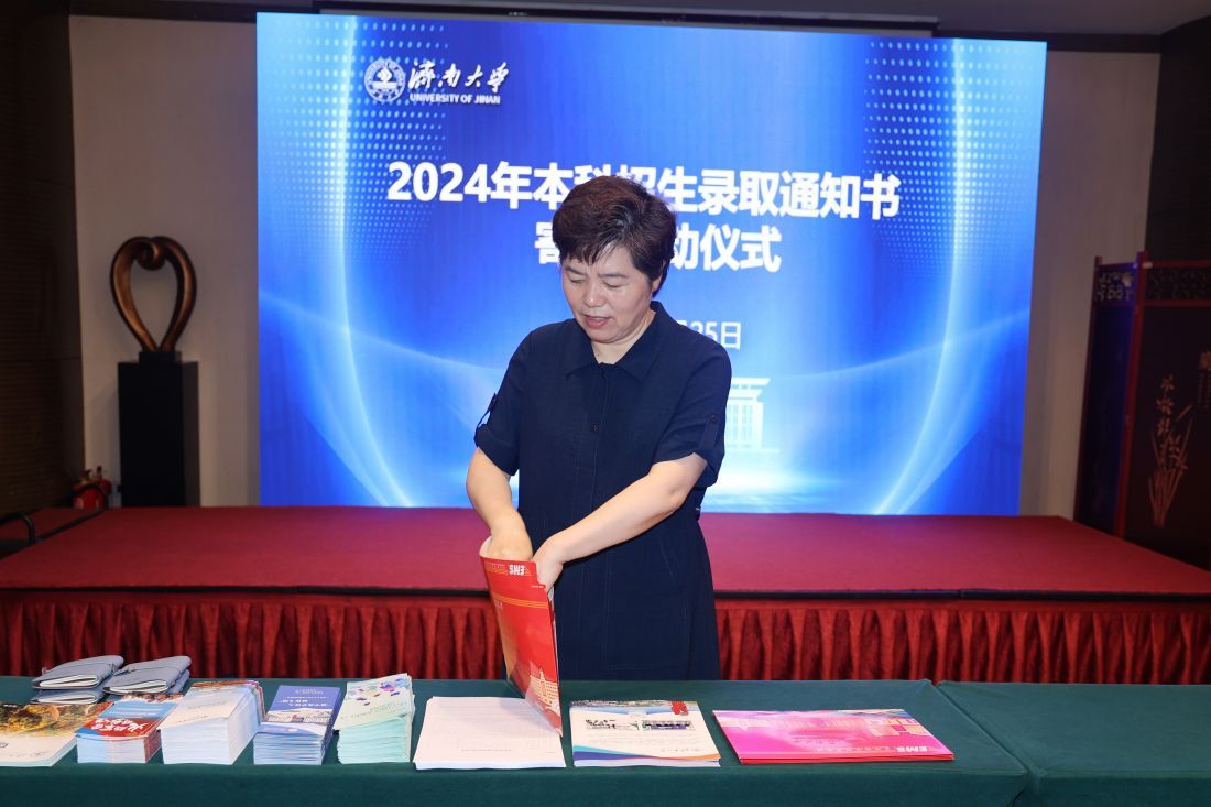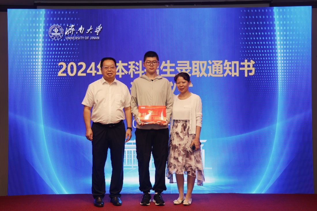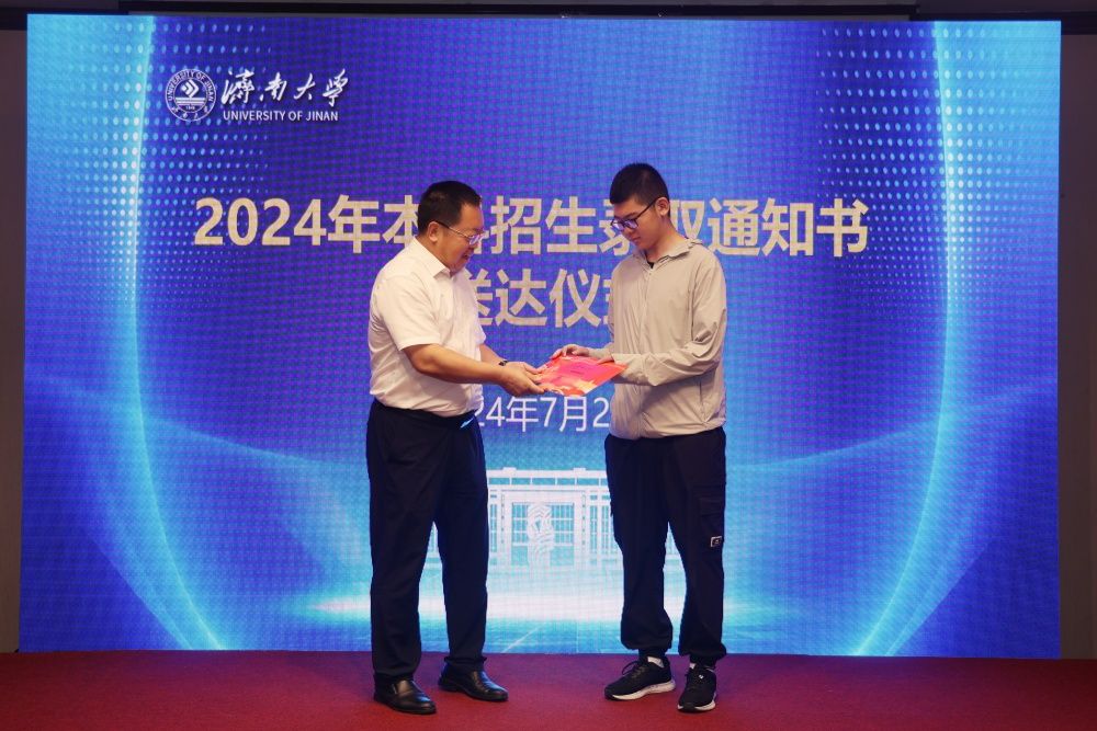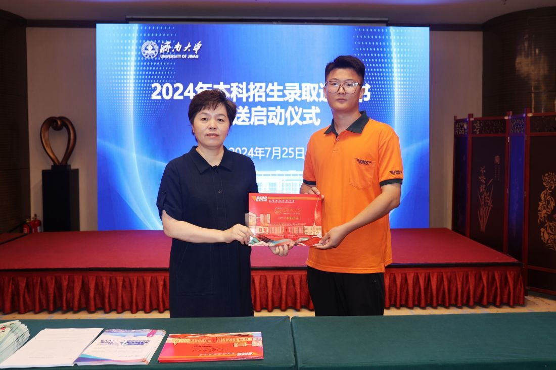 隨后,劉春華、劉宗明、王霞參加錄取通知書(shū)寄送啟動(dòng)和首份錄取通知書(shū)送達(dá)儀式。劉春華將編號(hào)為“2024010001”的錄取通知書(shū)、新生入學(xué)須知、具有濟(jì)大特色的文創(chuàng)紀(jì)念品等材料逐一裝入郵遞袋,并交接給中國(guó)郵政工作人員,標(biāo)志著我校第一批錄取通知書(shū)寄送工作正式啟動(dòng)。劉宗明為我校2024級(jí)材料物理(新能源材料拔尖創(chuàng)新實(shí)驗(yàn)班)韓鴻錦同學(xué)送達(dá)第一份錄取通知書(shū),并鼓勵(lì)韓鴻錦同學(xué)要胸懷大志、腳踏實(shí)地,做德智體美勞全面發(fā)展的社會(huì)主義合格建設(shè)者和可靠接班人。
