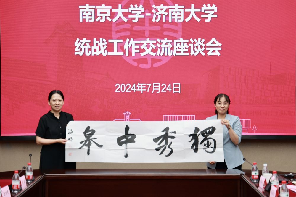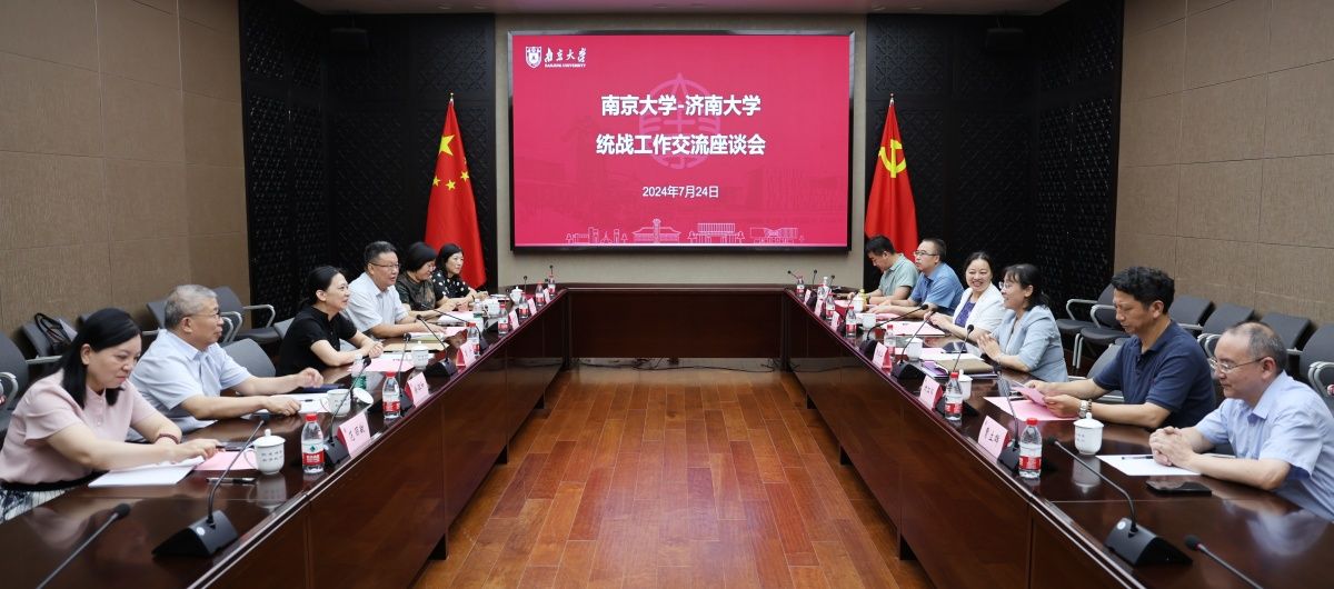 焦瑞華對商華一行表示誠摯歡迎,并介紹了南京大學(xué)辦學(xué)歷史、辦學(xué)特色和統(tǒng)戰(zhàn)重點工作情況。她表示南京大學(xué)歷史悠久、底蘊深厚,為國家富強和民族振興作出了重要貢獻,當(dāng)前全校正深入實施“奮進行動”,全面推進中國特色世界一流大學(xué)建設(shè)。學(xué)校黨委高度重視統(tǒng)戰(zhàn)工作,堅持賡續(xù)光榮傳統(tǒng),發(fā)揮特色優(yōu)勢,著力構(gòu)建大統(tǒng)戰(zhàn)工作格局,團結(jié)引領(lǐng)黨外知識分子圍繞中心、服務(wù)大局。廣大師生員工牢記習(xí)近平總書記給南京大學(xué)留學(xué)歸國青年學(xué)者重要回信精神,積極為學(xué)校高質(zhì)量發(fā)展、服務(wù)經(jīng)濟社會發(fā)展,為強國建設(shè)、民族復(fù)興偉業(yè)貢獻力量。她認為,濟南大學(xué)統(tǒng)戰(zhàn)工作特色鮮明、成果顯著,希望以本次調(diào)研交流為契機,雙方共學(xué)共悟黨的二十屆三中全會精神,加強交流、深化合作,為推動高校統(tǒng)戰(zhàn)工作高質(zhì)量發(fā)展貢獻智慧和力量。
