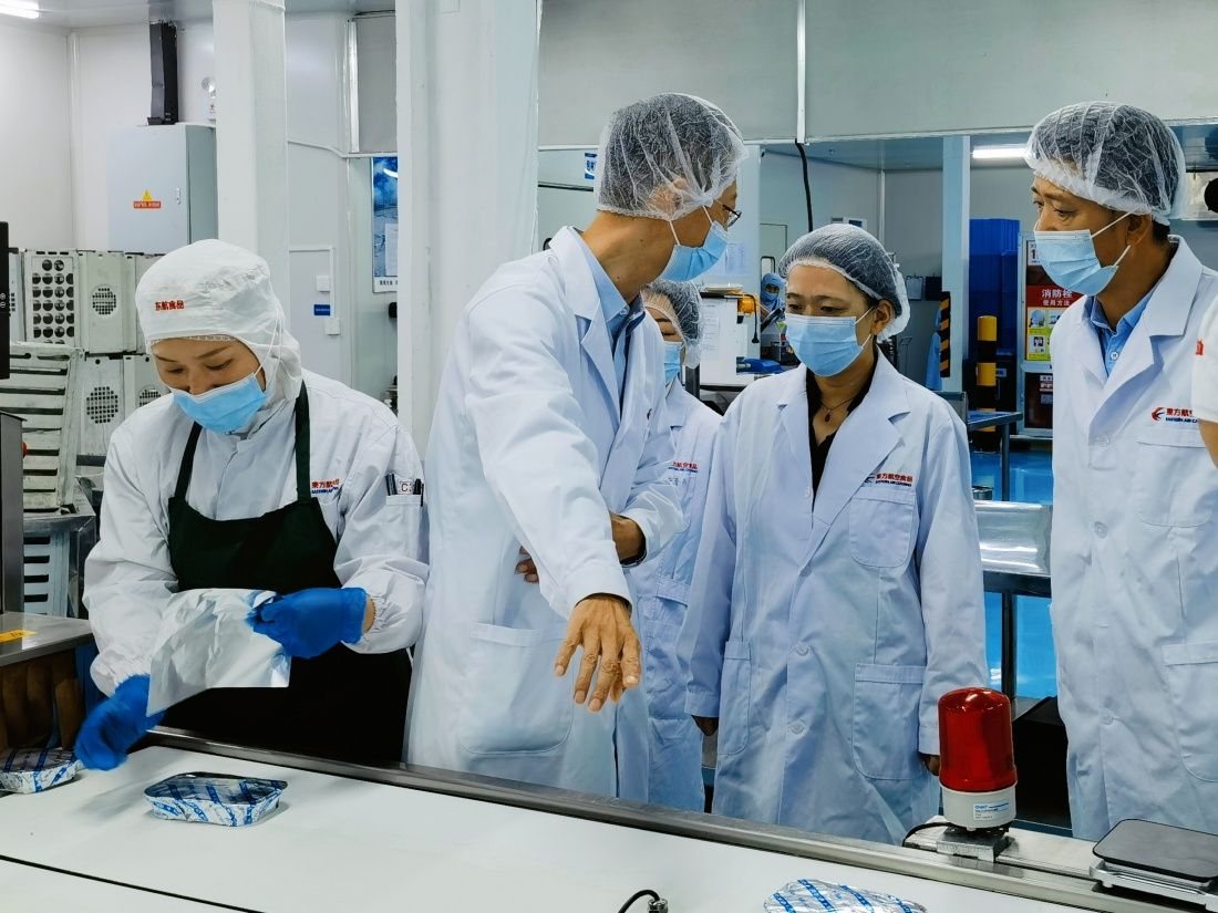 隨后,商華一行參觀了齊魯東方航空食品有限公司的食品制作車間,深入了解了航空食品的生產(chǎn)流程、質(zhì)量控制及安全管理體系等方面的內(nèi)容。通過(guò)實(shí)地參觀與交流,雙方進(jìn)一步加深了了解,為未來(lái)的深入合作奠定了堅(jiān)實(shí)基礎(chǔ)。