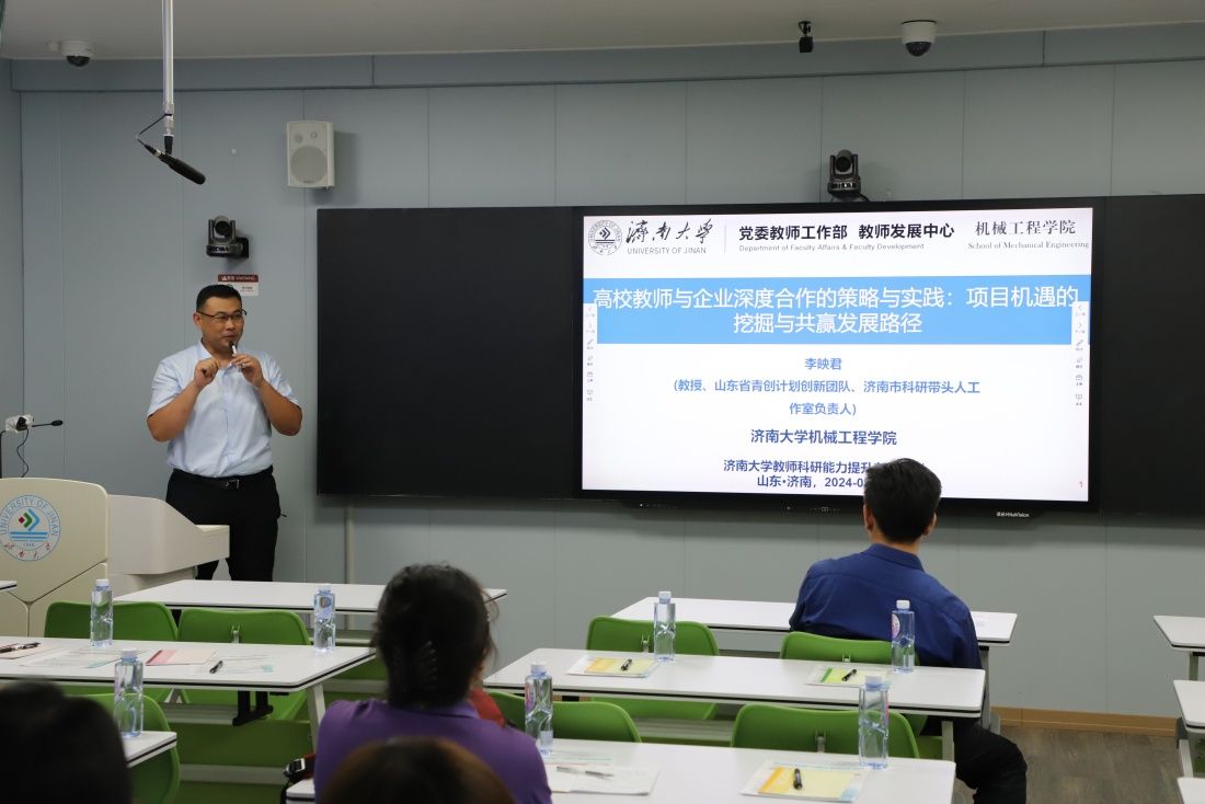 山東省青創(chuàng)計(jì)劃創(chuàng)新團(tuán)隊(duì)、濟(jì)南市科研帶頭人工作室負(fù)責(zé)人、機(jī)械工程學(xué)院教授李映君作題為“高校教師與企業(yè)深度合作的策略與實(shí)踐:項(xiàng)目機(jī)遇的挖掘與共贏發(fā)展路徑”的報(bào)告。他結(jié)合自身服務(wù)企業(yè)的豐富實(shí)踐與案例研究,介紹了高校教師與企業(yè)合作的現(xiàn)狀,分享了如何利用學(xué)科優(yōu)勢爭取項(xiàng)目機(jī)會(huì),為企業(yè)創(chuàng)新發(fā)展服務(wù),實(shí)現(xiàn)雙贏的思路和感悟。
