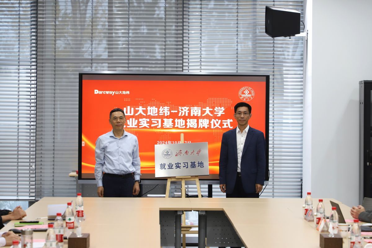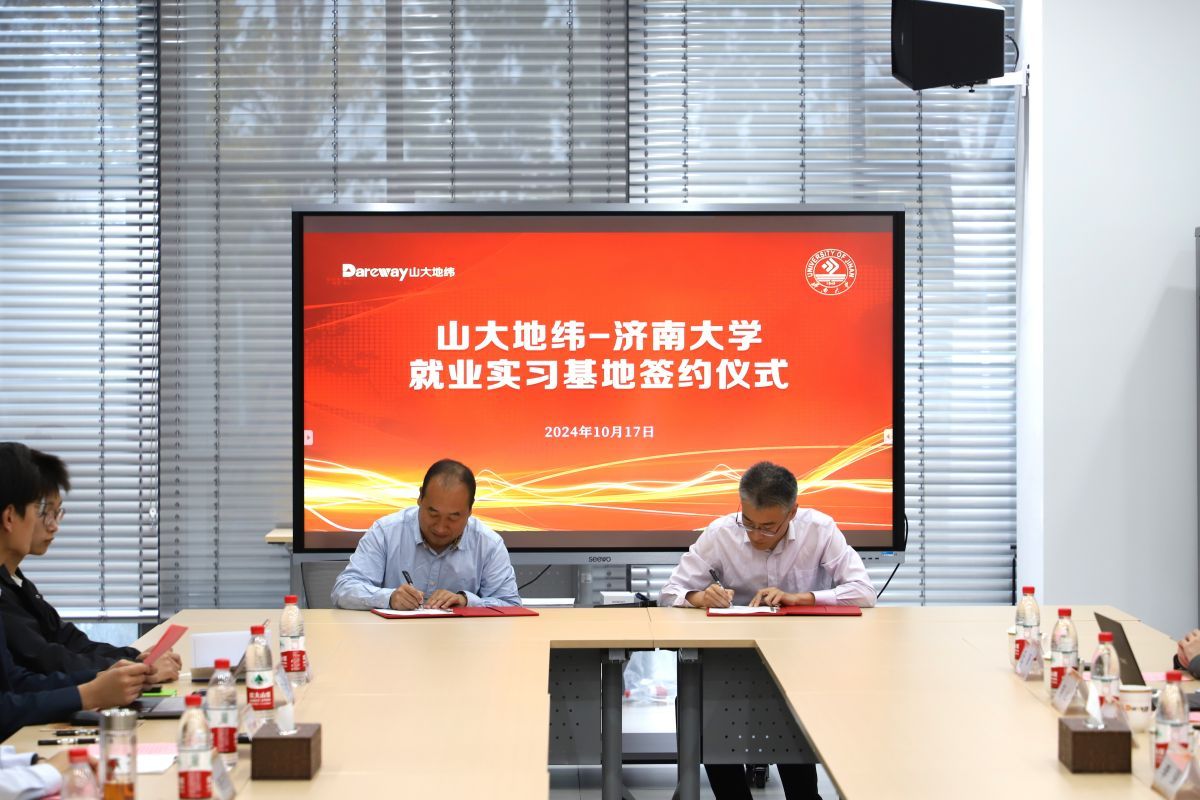 簽約儀式上,濟(jì)南大學(xué)黨委學(xué)生工作部(處)副部(處)長(zhǎng)董俊杰代表學(xué)校與山大地緯軟件股份有限公司副總裁徐喆簽訂《畢業(yè)生就業(yè)實(shí)習(xí)基地協(xié)議》,李強(qiáng)和李慶忠共同為“濟(jì)南大學(xué)就業(yè)實(shí)習(xí)基地”揭牌。