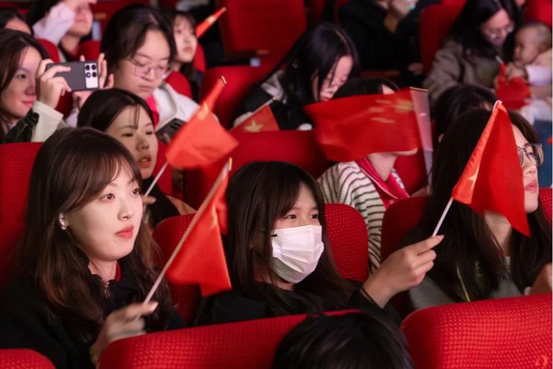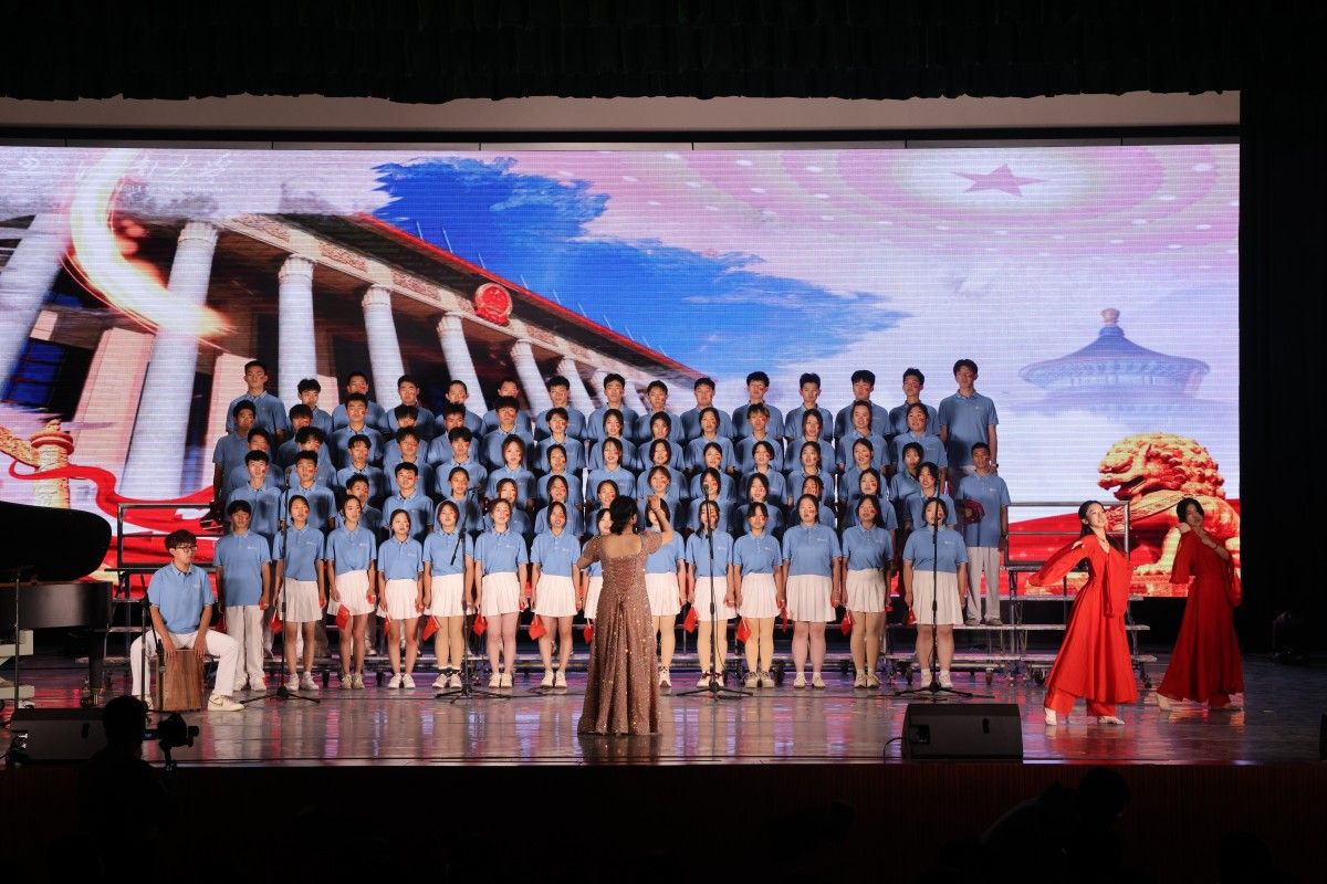 匯報展演現(xiàn)場,學(xué)校黨委常委、副校長王霞領(lǐng)銜學(xué)工合唱團(tuán)唱響校歌《你我同行》,以歌載夢,謳歌學(xué)校,激勵學(xué)子?;迎h(huán)節(jié),全體觀眾共同揮動手中的國旗,滿懷著對祖國的熱愛,高聲合唱《萬疆》。
